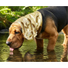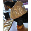 Gold shimmer polyester/spandex snood to protect the ears of long eared dogs. Keep your dogs ears out of the mud and food bowls. Elastic closures around the head and neck is comfortable. Machine wash and dry medium heat. Will not wrinkle.